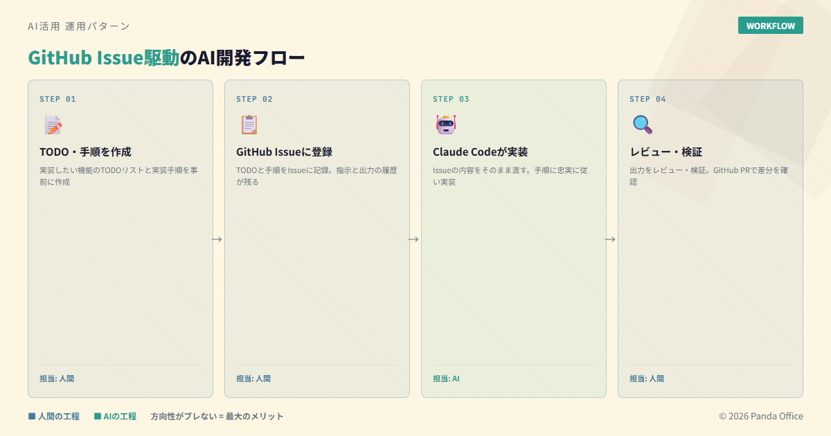 - GitHub Issue駆動 — TODOと実装手順を先に定義してAIに渡す
