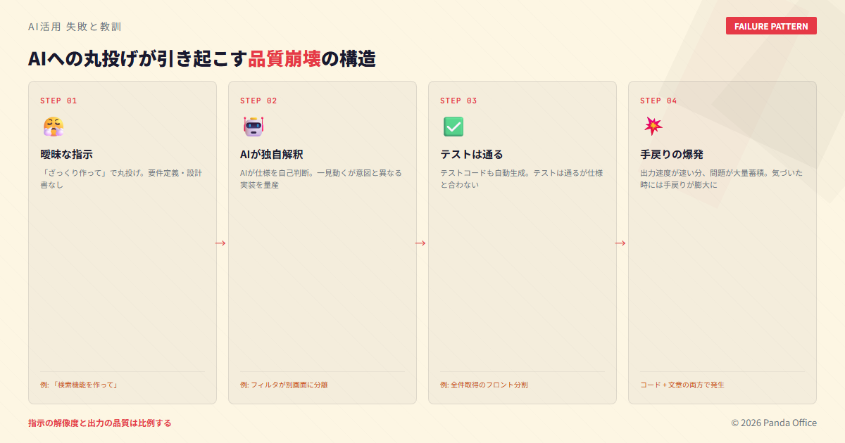 これは人間のエンジニアでも起きる問題だが、AIの場合は出力速度が速い分、問題が大量に蓄積してから発覚する。気づいた時には手戻りが膨大になっていた。