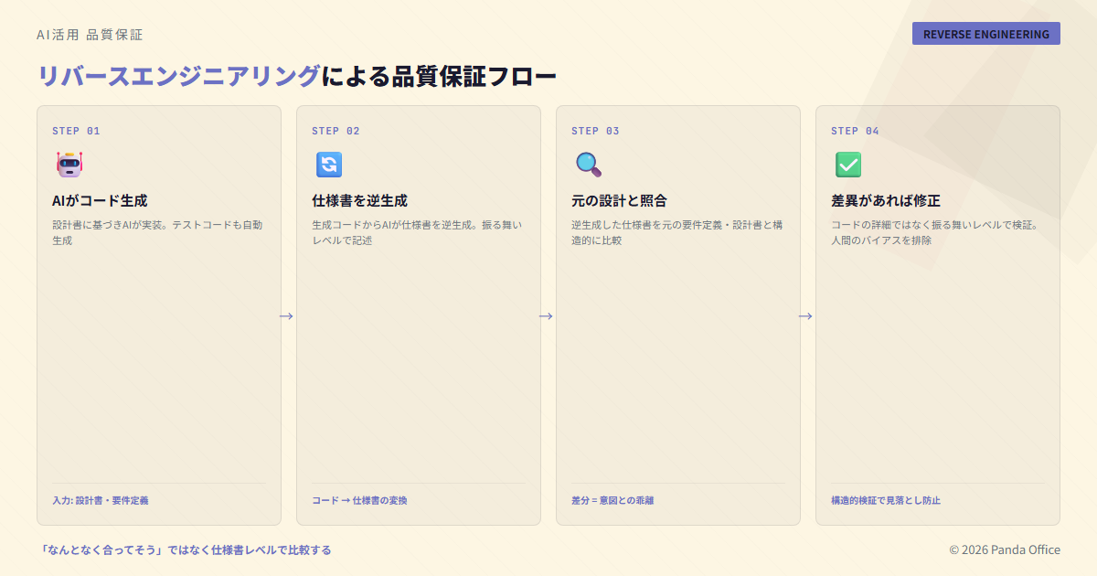 リバースエンジニアリングによる仕様書照合は、その変化への一つの対応策だ。しかし、さらにAIの精度が向上すれば、レビューのやり方そのものが変わっていくだろう。今のやり方に固執せず、常にアップデートし続ける姿勢が必要だ。