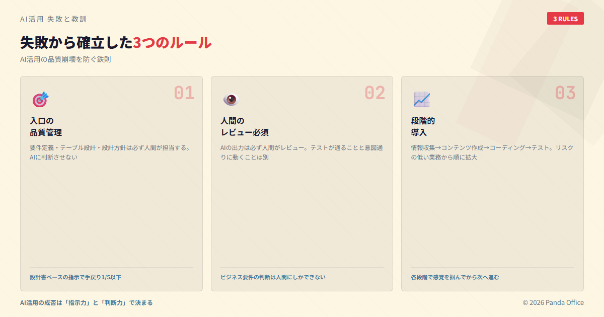 初期設計を人間がやることで、AIの出力品質が劇的に変わる。「ざっくり作って」ではなく、**「この設計書に基づいて実装して」**と指示するだけで、手戻りは1/5以下になった。