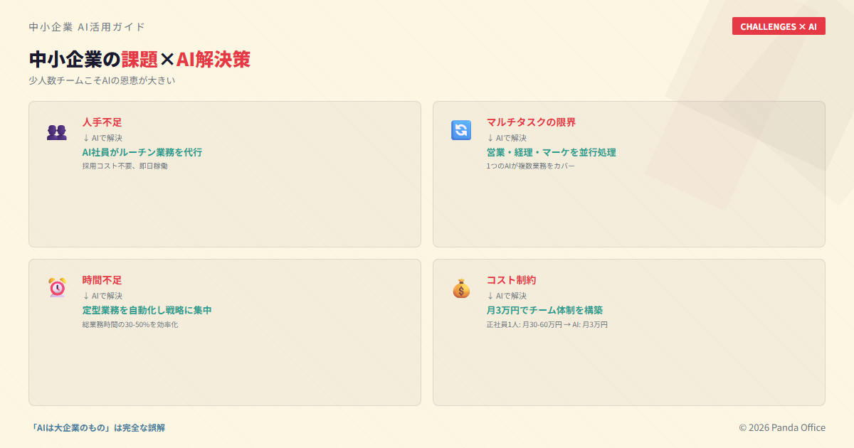 Panda Officeは代表1人+AI社員4名という体制で事業を運営しています。この記事では、その実体験をベースに、1人社長・少人数チームが今日からできるAI活用を具体的に解説します。