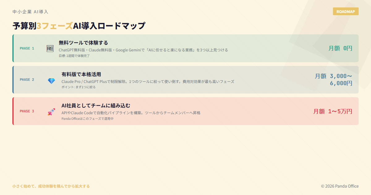 まずはコストをかけずに「AIにどんな仕事を任せられるか」を体感するフェーズです。