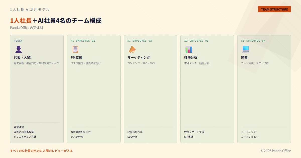 Panda Officeの体制を例に、1人社長+AIのチーム構成を紹介します。