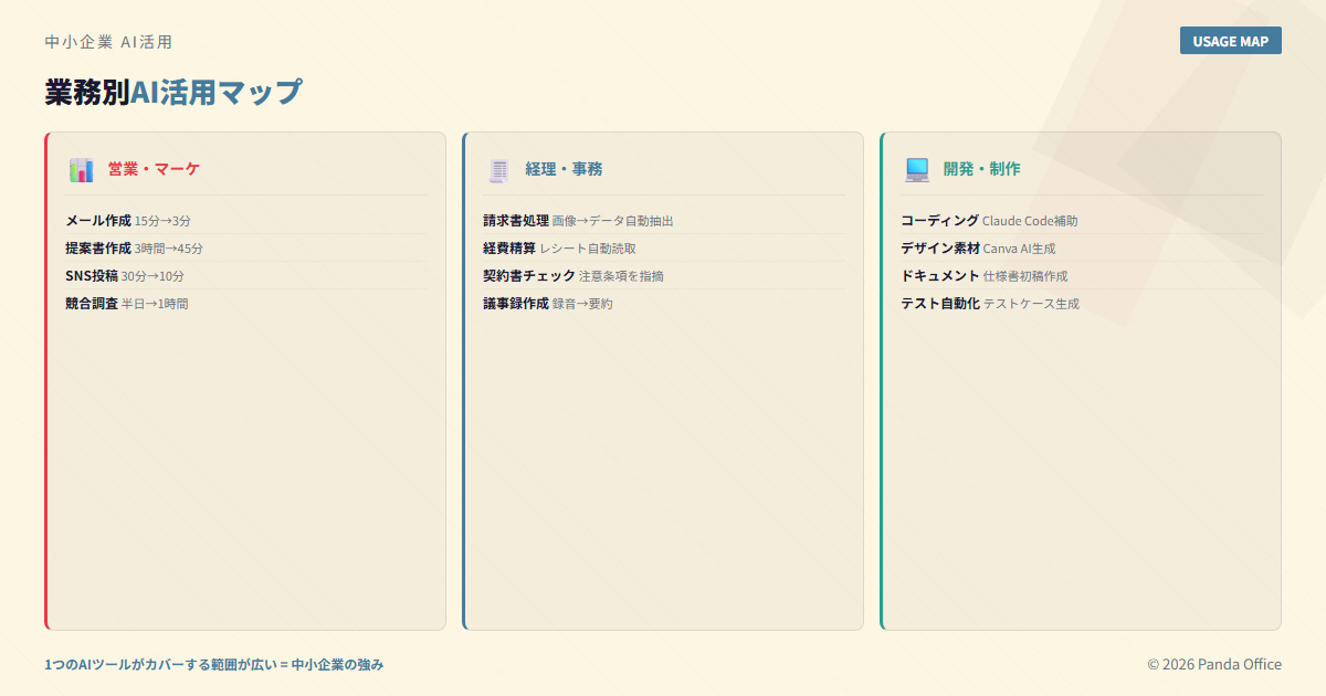 実は、AIの恩恵を最も受けられるのは中小企業や少人数チームです。大企業のように専門部署がある組織よりも、少人数で多くの業務をこなす現場のほうが、1つのAIツールがカバーする範囲が広く、効果を実感しやすいのです。