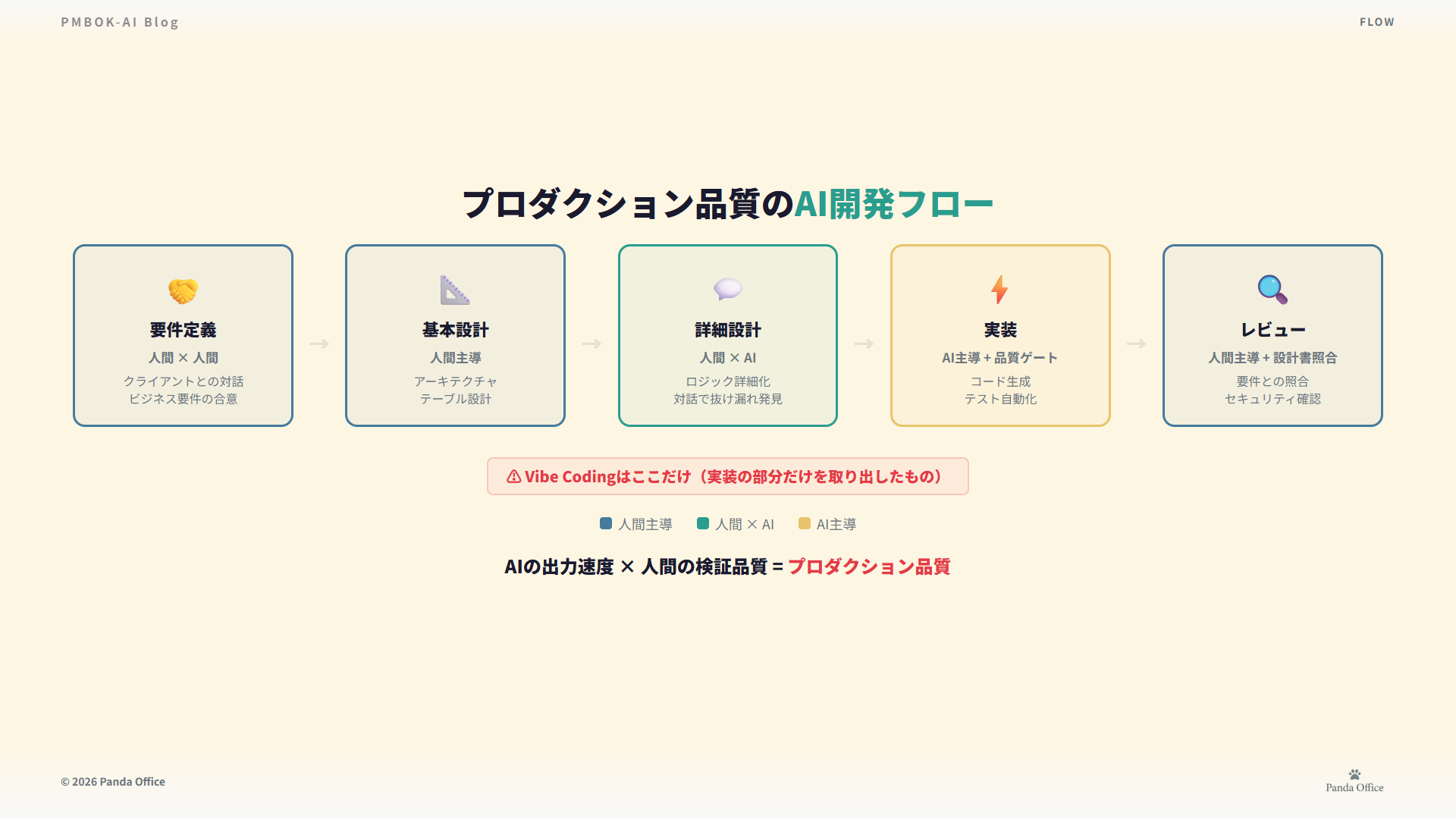 以前、Vibe Codingの先へ|個人開発と商用開発の決定的な違いという記事を書いた。「コーディングの工程は同じ。その前後の設計・テスト・レビュー・インフラが全く違う」という話だ。