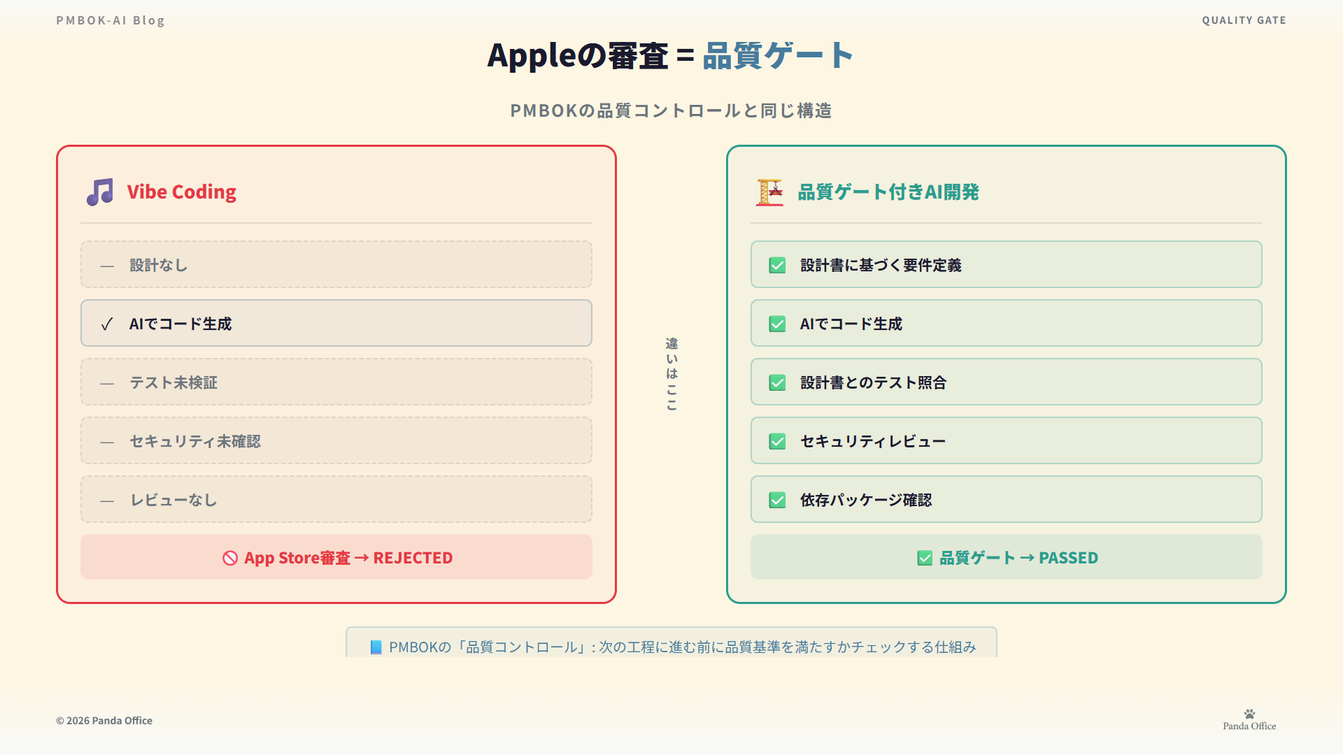 App Storeの審査は、まさにこの品質ゲートだ。Vibe Codingには、この仕組みが内在していない。 だから外部のゲート(Appleの審査)に引っかかる。