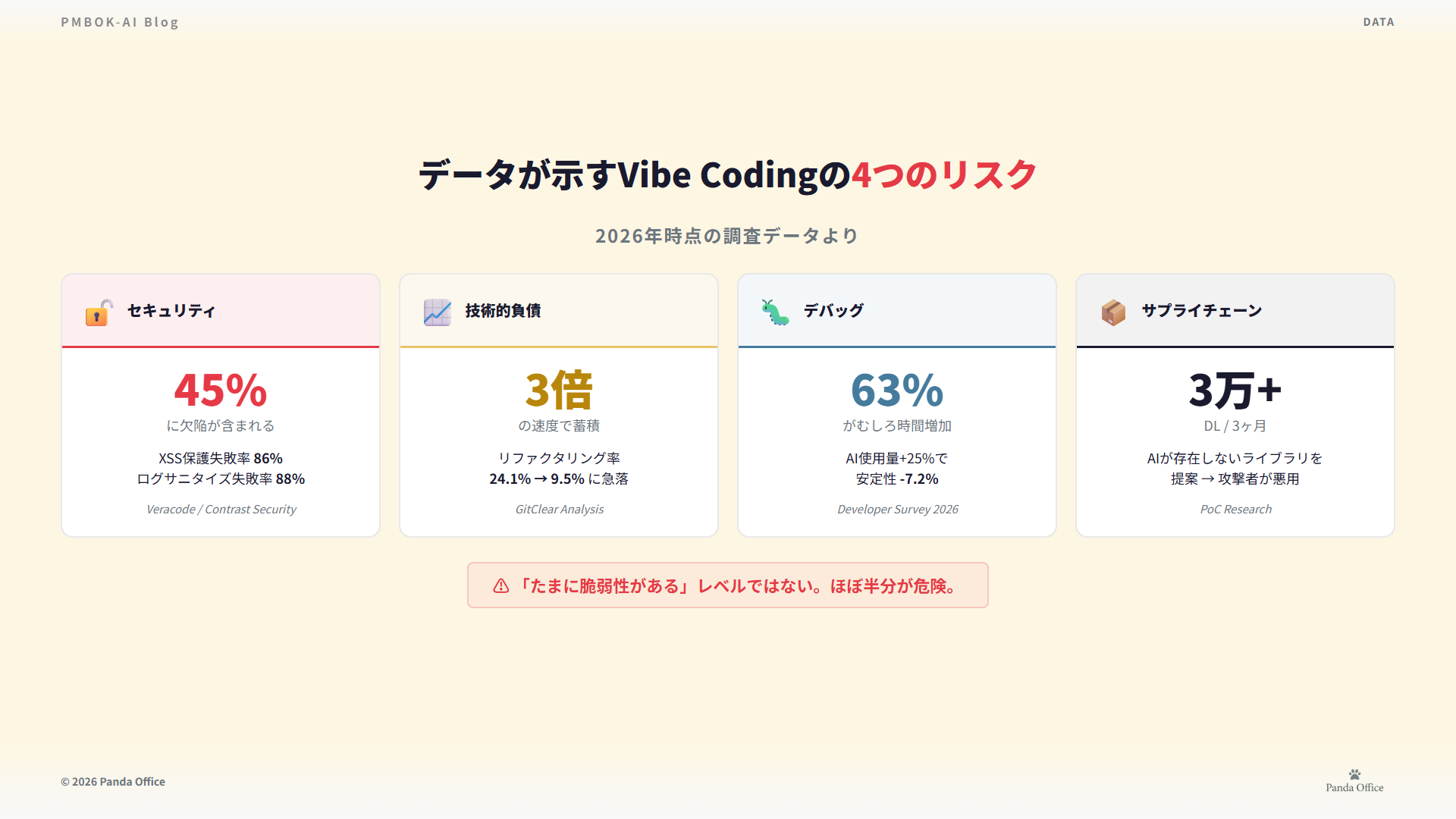 - AI生成コードの45%に脆弱性 → 検証プロセスで防げる