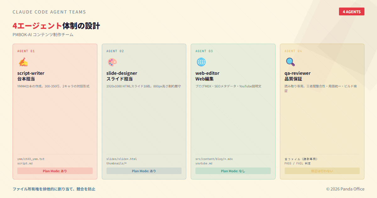 PMとしてチームを設計する際、まず考えたのはファイルの競合を起こさないことだ。2つのエージェントが同じファイルを同時に編集すれば、片方の変更が消える。