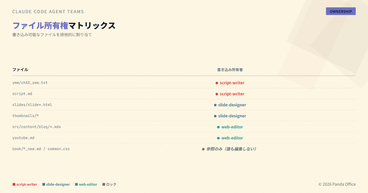 最初は「柔軟にやればいい」と思っていたが、2つのエージェントが同じファイルを触った瞬間に片方の変更が消えた。所有権マトリックスを定義してからは一度も起きていない。