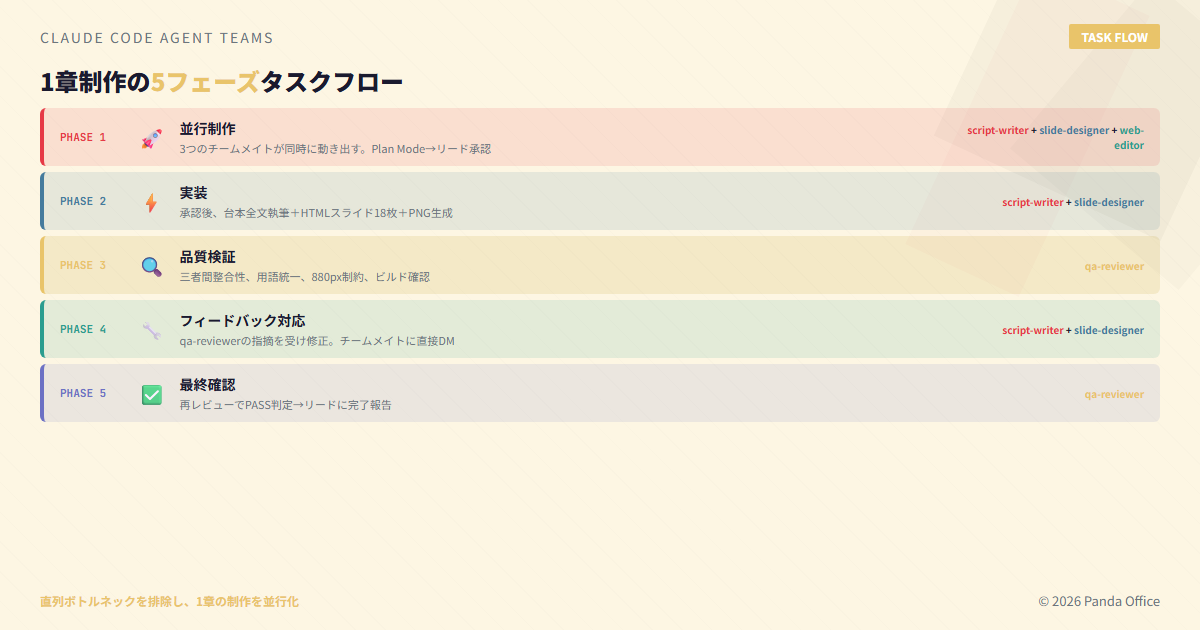 - slide-designer: script.mdを読み、18枚のレイアウトを設計(Plan Mode → リード承認)