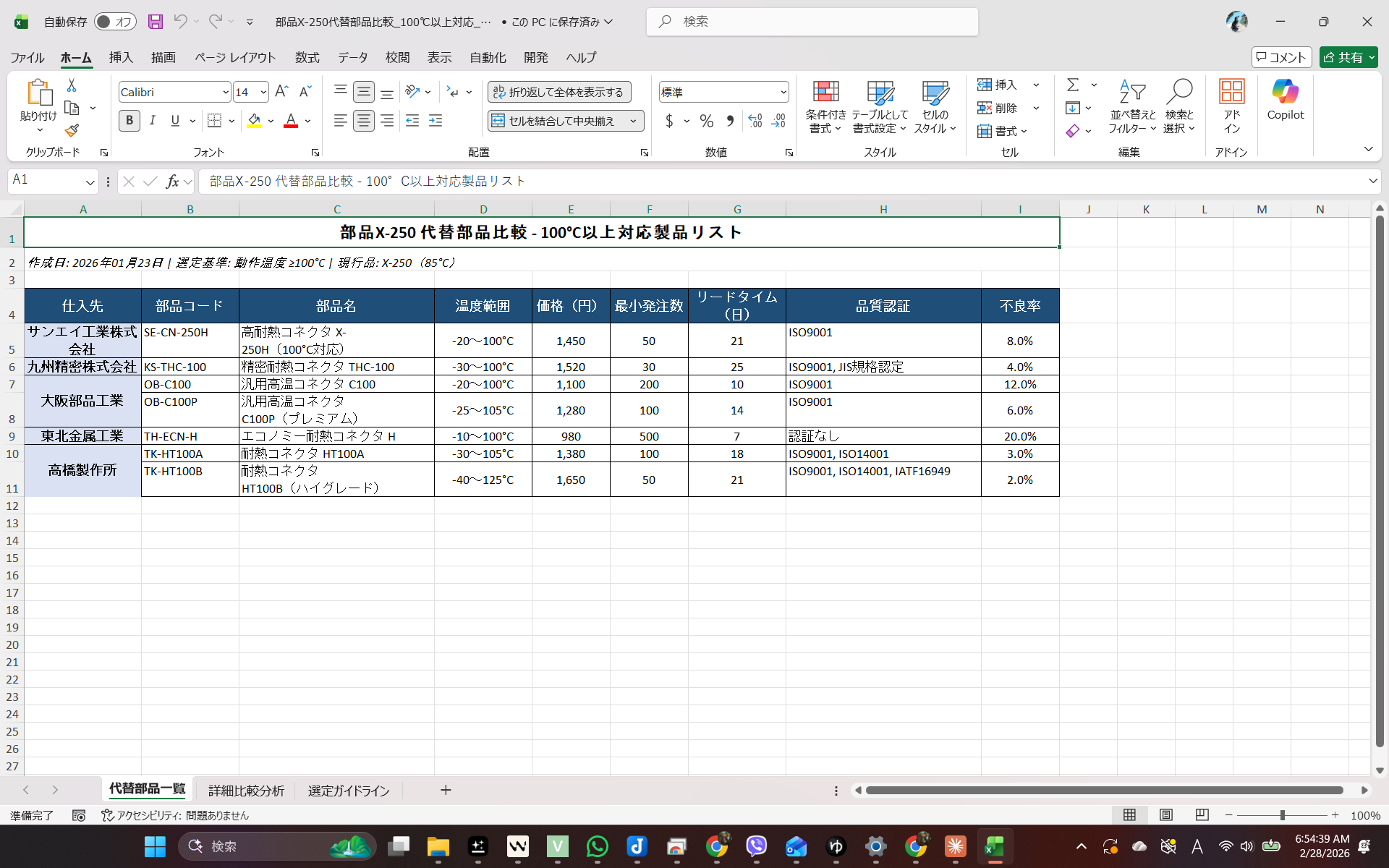 この一連の流れ——データ収集、比較分析、選定ガイドライン生成——が1回の指示で完了する。従来なら担当者が各仕入先に問い合わせ、カタログを取り寄せ、Excelで比較表を作成していた作業だ。