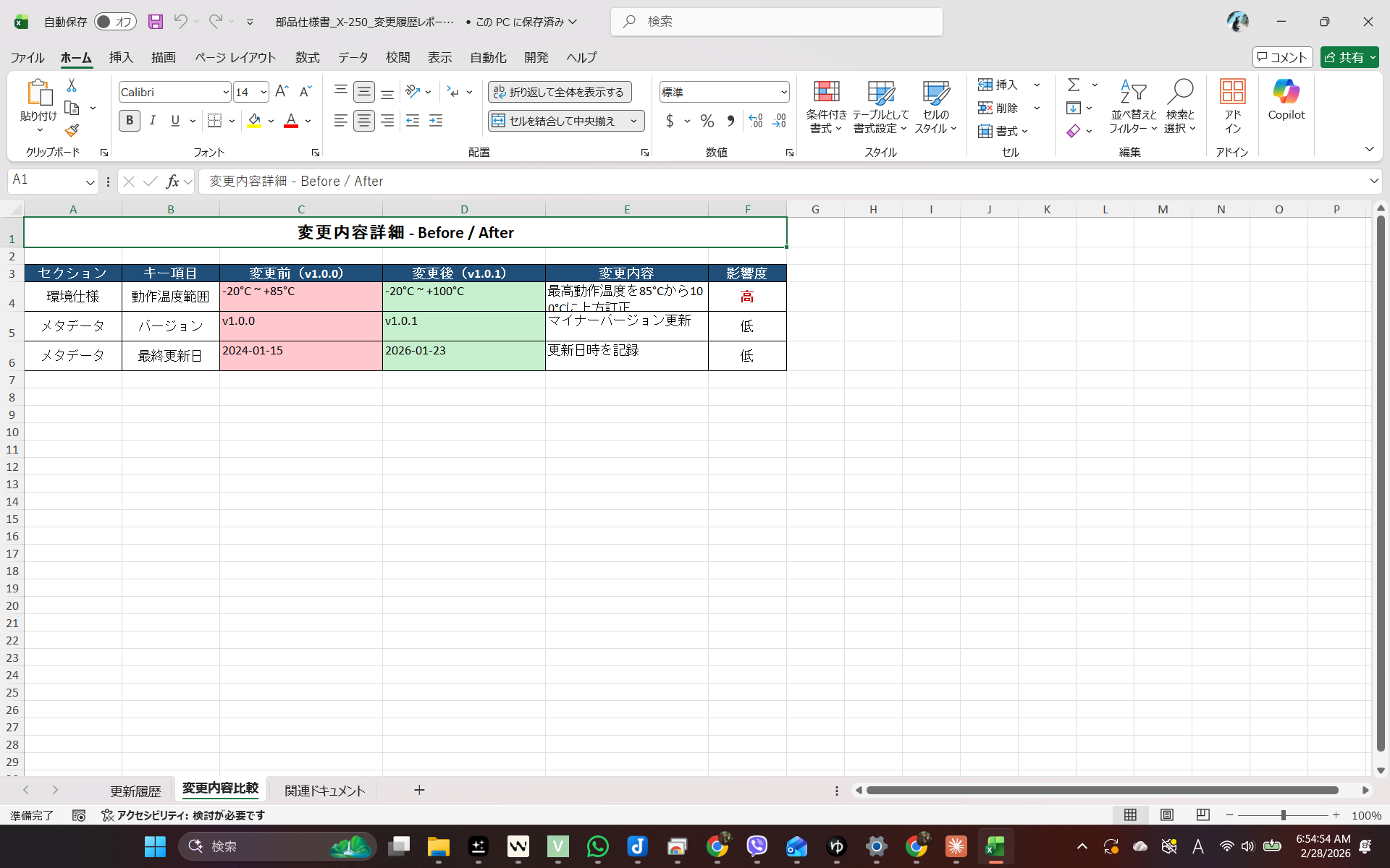 Excel形式にしたのは理由がある。非エンジニアの関係部署にも共有しやすいからだ。設計部や購買部の担当者にJSON形式やMarkdownのレポートを送っても読んでもらえない。Excelなら、そのまま会議資料や承認申請の添付資料として使える。