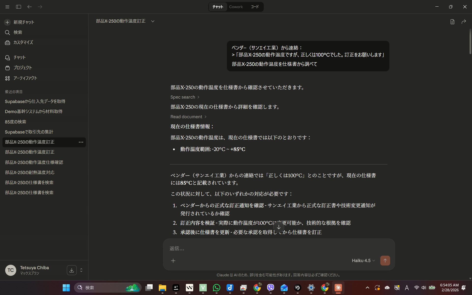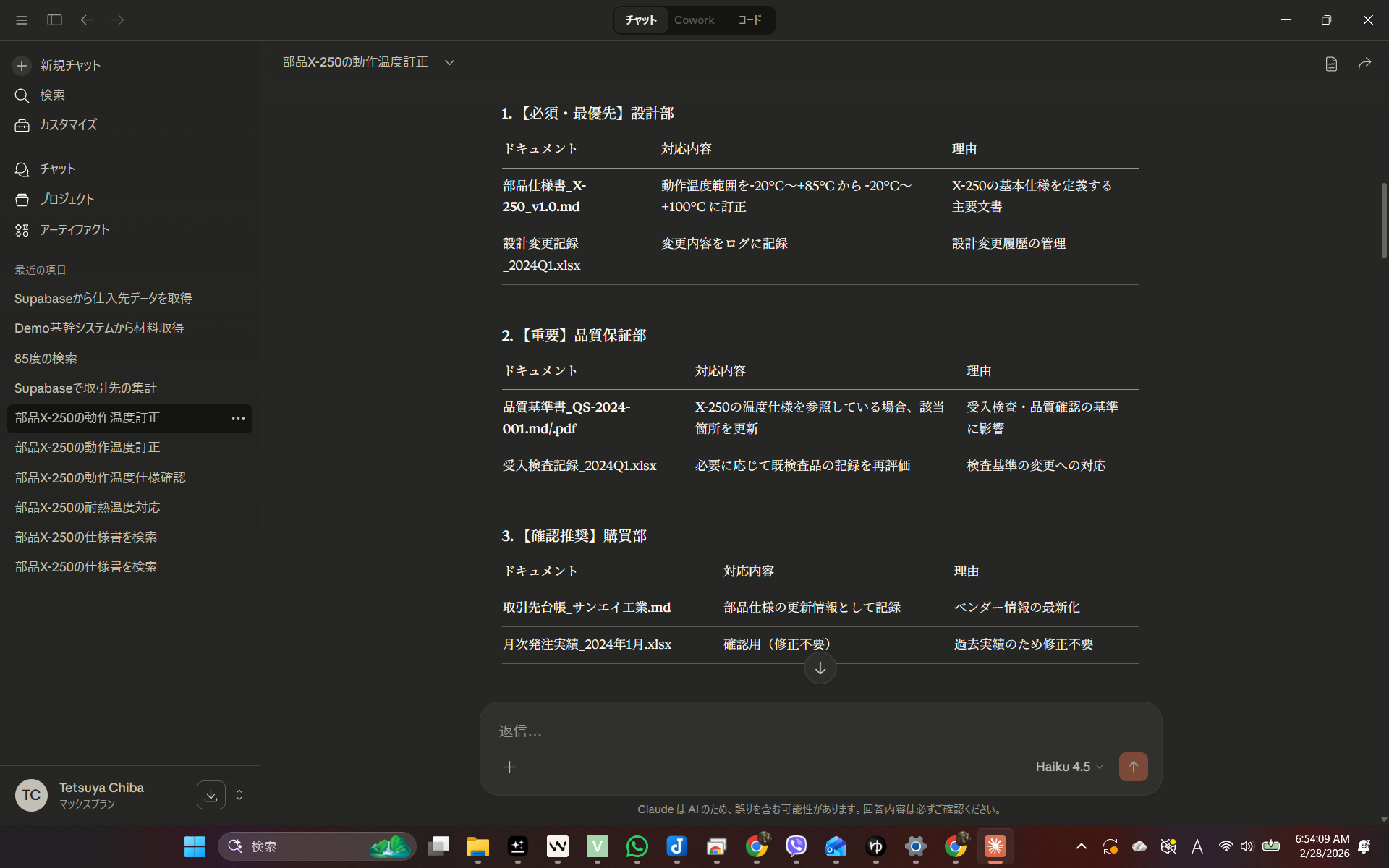セミナーでは、ドキュメント管理に加えて代替部品の比較分析も実演した。MCPサーバーがSupabaseの仕入先データベースを横断検索し、条件に合う代替部品を自動でリストアップする。
