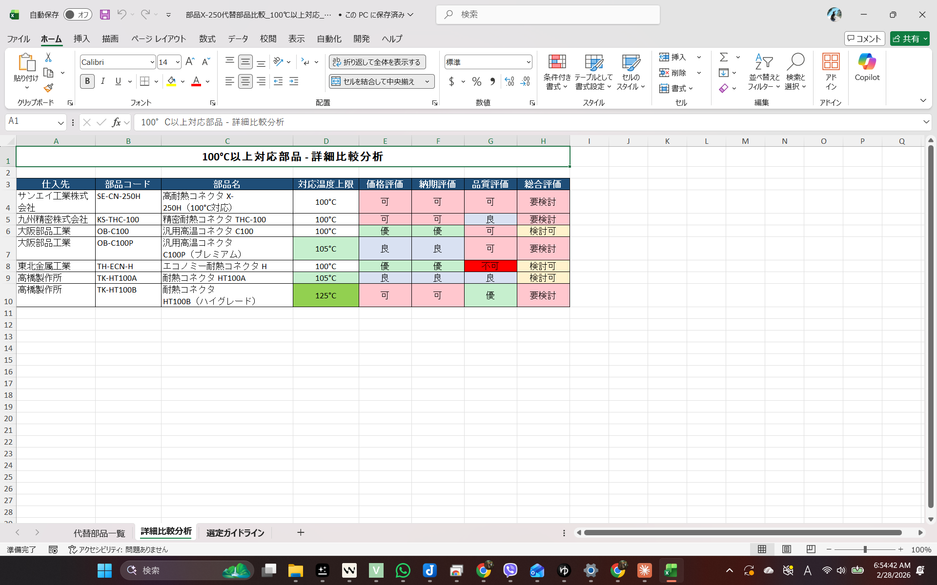 リストアップだけでなく、詳細比較分析まで自動で行う。価格・納期・品質を多軸で評価し、各部品の総合評価を算出する。