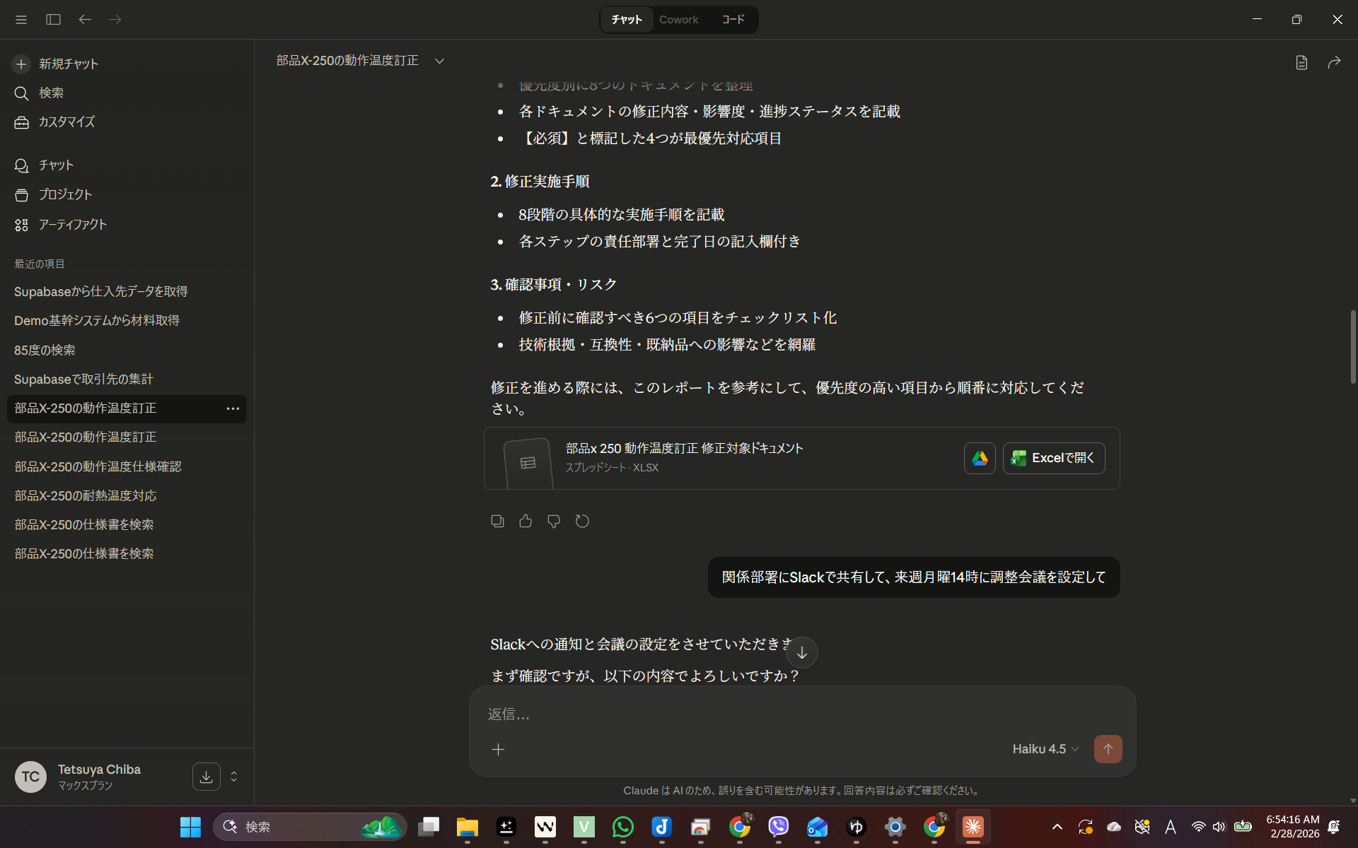 さらに、レポートの共有と会議設定までMCPで自動化できる。「関係部署にSlackで共有して、来週月曜14時に調整会議を設定して」——この一言で、Slack通知と会議設定が自動実行される。