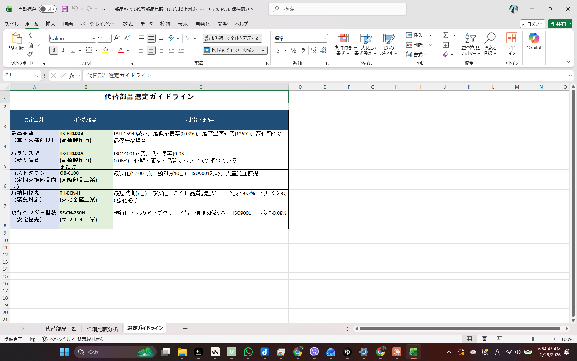 さらに、用途別の選定ガイドラインまで生成される。最高品質が求められる車・医療向け、コストダウン、短納期優先など、シーン別に推奨部品と理由が整理される。