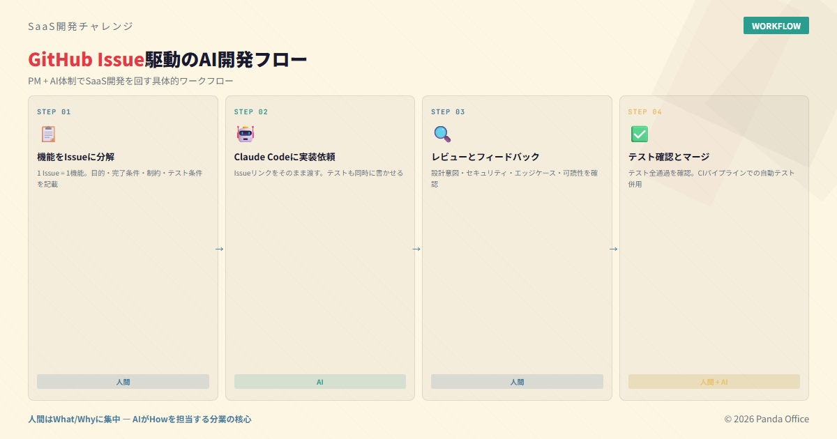 ここからが、この記事で最も伝えたい内容です。PM+AI体制でSaaS開発を回すための具体的なワークフローを、詳細に解説します。