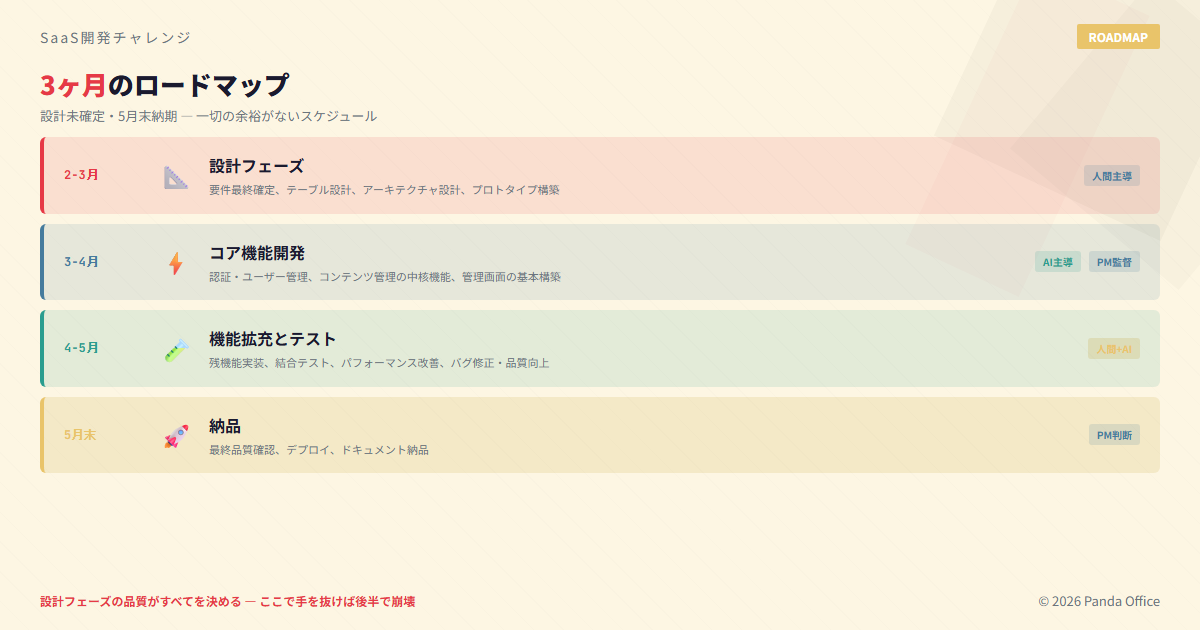 私は6月末完成の線表を提案しました。そこそこの規模のSaaSを、設計からスタートして4ヶ月で完成させる。これでも相当攻めたスケジュールです。