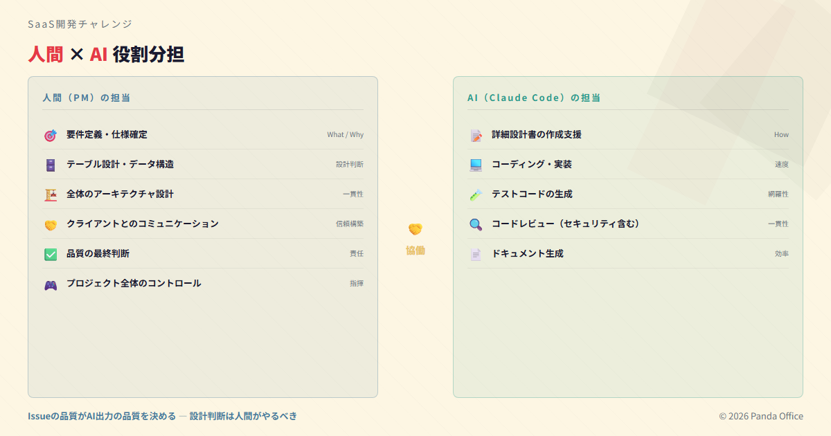 PMの仕事は「正しいものを定義すること」に集約され、「正しく作ること」はAIが担う。この分業が機能するからこそ、1人+AIでSaaS開発が成立するのです。