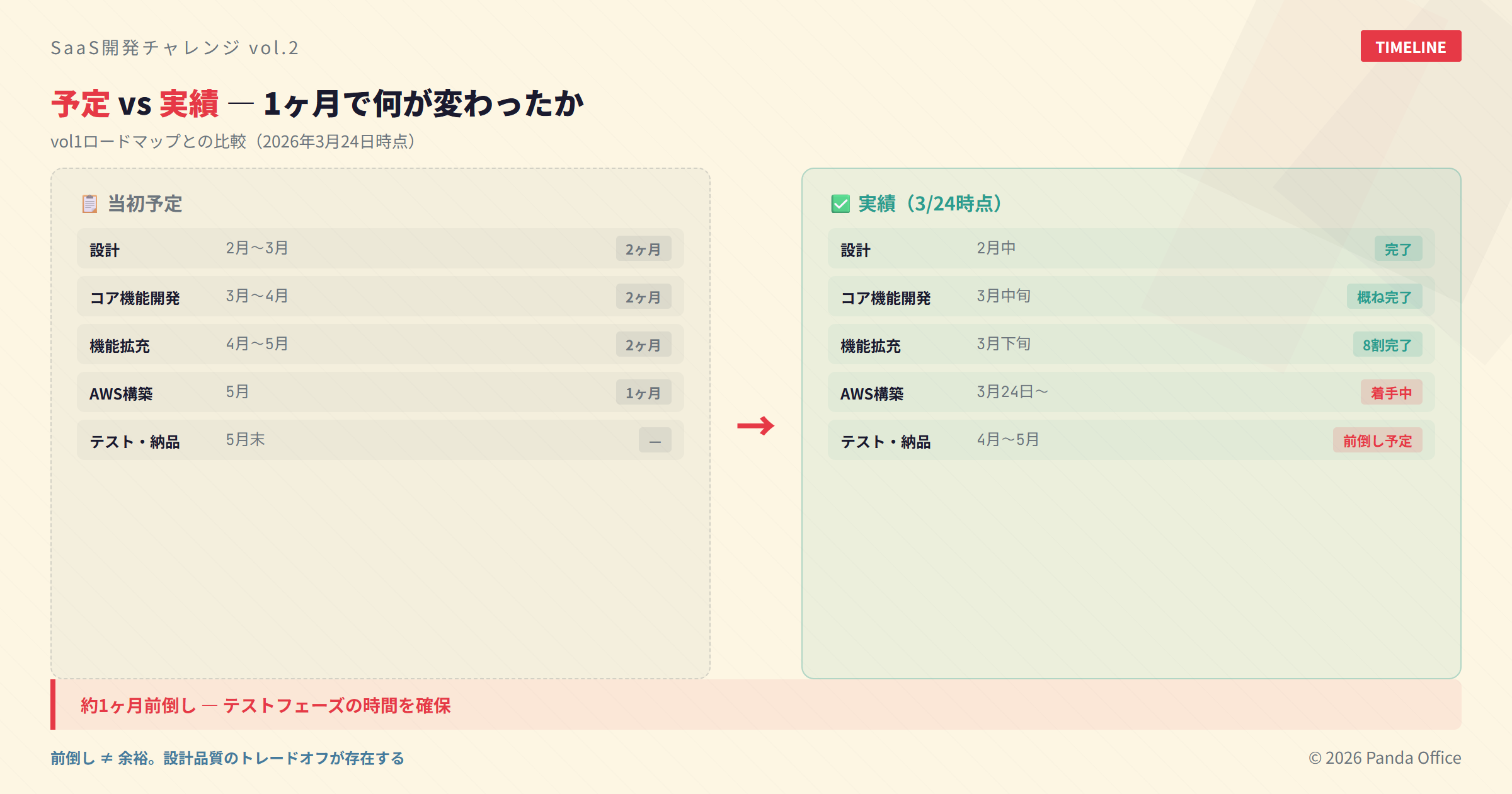 ただし「前倒し=余裕がある」ではありません。クライアントから「5月リリースを前提にスケジュールを組んでほしい」と言われた時点で、テスト前倒しのトレードオフが発生しています。設計品質を削ってスピードを取った箇所もあります。この点は後述します。