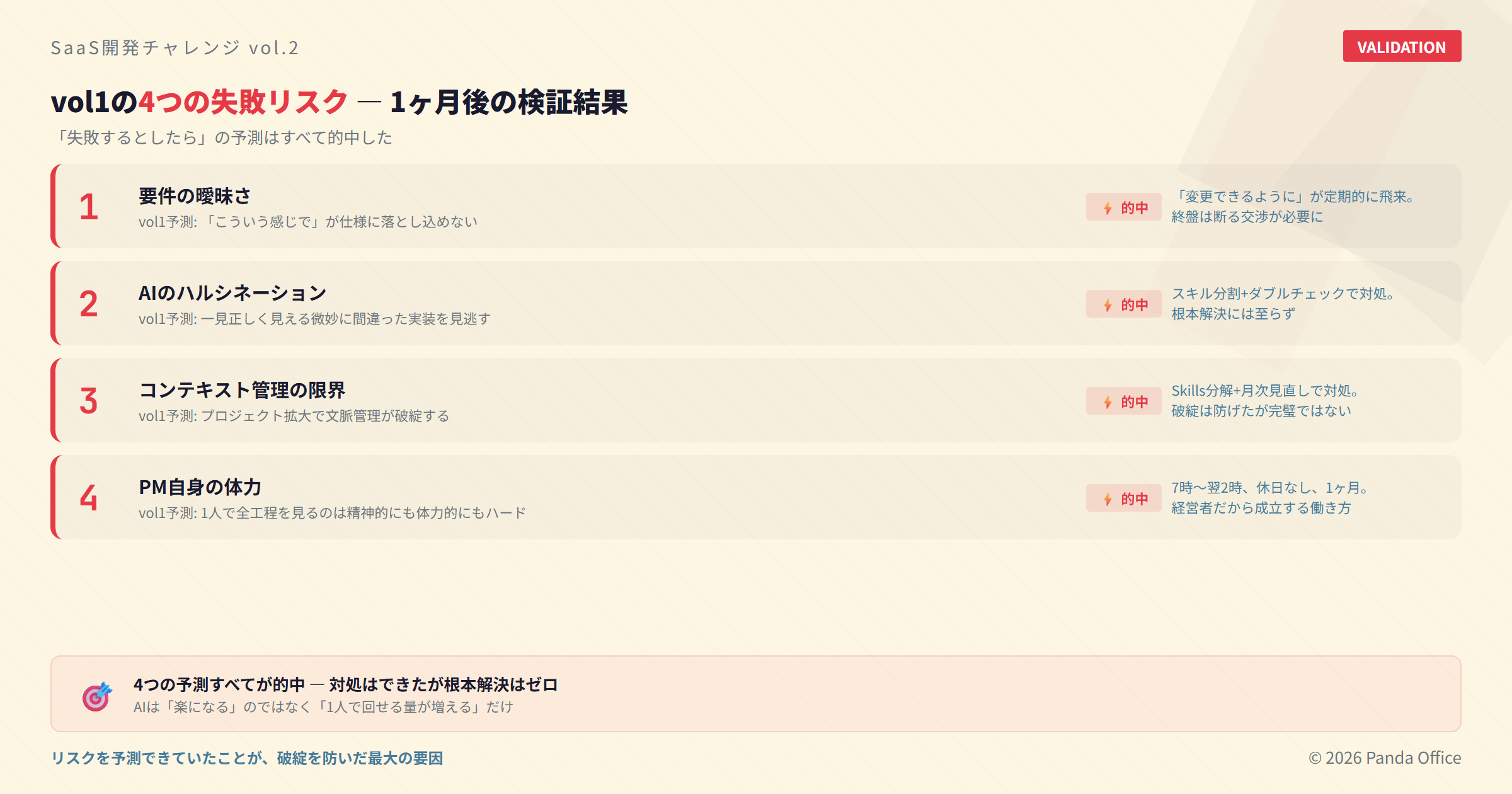 vol1で「このプロジェクトが失敗するとしたら」と挙げた4つのリスク。1ヶ月後の答えを正直に書きます。
