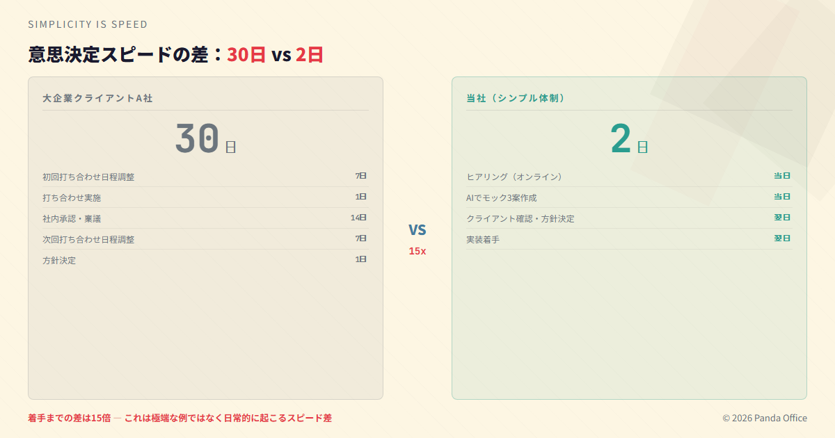 着手までの差は15倍。 これは極端な例ではない。大企業との協業では日常的に起こるスピード差だ。