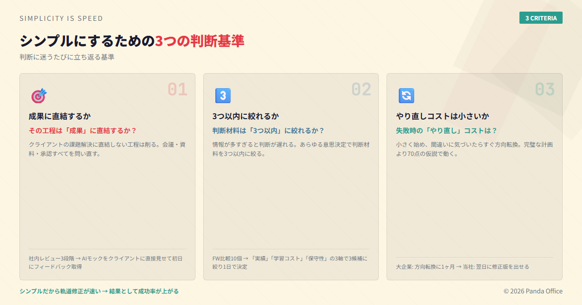シンプルにする。判断基準を3つに絞る。モックで「言語化の壁」を壊す。AIで実行速度を上げる。小さく始めて、間違いに気づいたらすぐ方向転換する。
