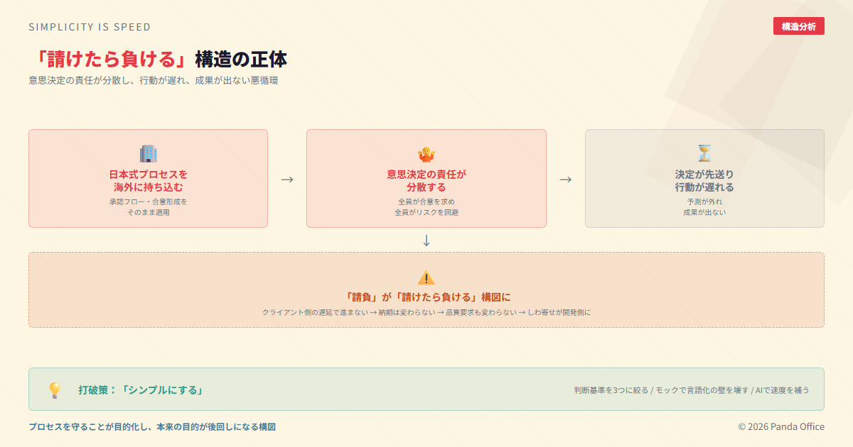 もちろん、大企業のプロセスには理由がある。ガバナンス、コンプライアンス、リスク管理——すべて組織を守るために必要な仕組みだ。しかし、それを小規模な案件やスピードが求められる局面にそのまま適用すると、プロセスを守ることが目的化し、本来の「クライアントの課題を解決する」という目的が後回しになる。