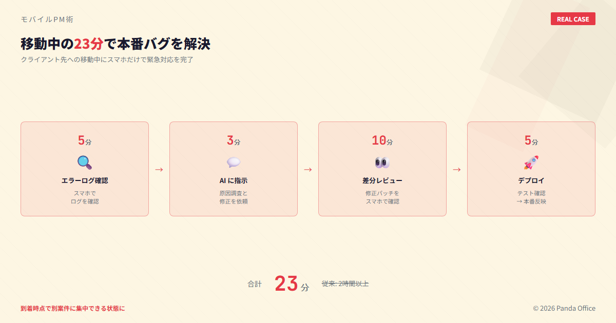 「場所に縛られない開発体制」は、1人PMにとって最大の競争優位になる。 実際に、移動中の23分で本番バグの緊急対応を完了できた実績がその裏付けだ。