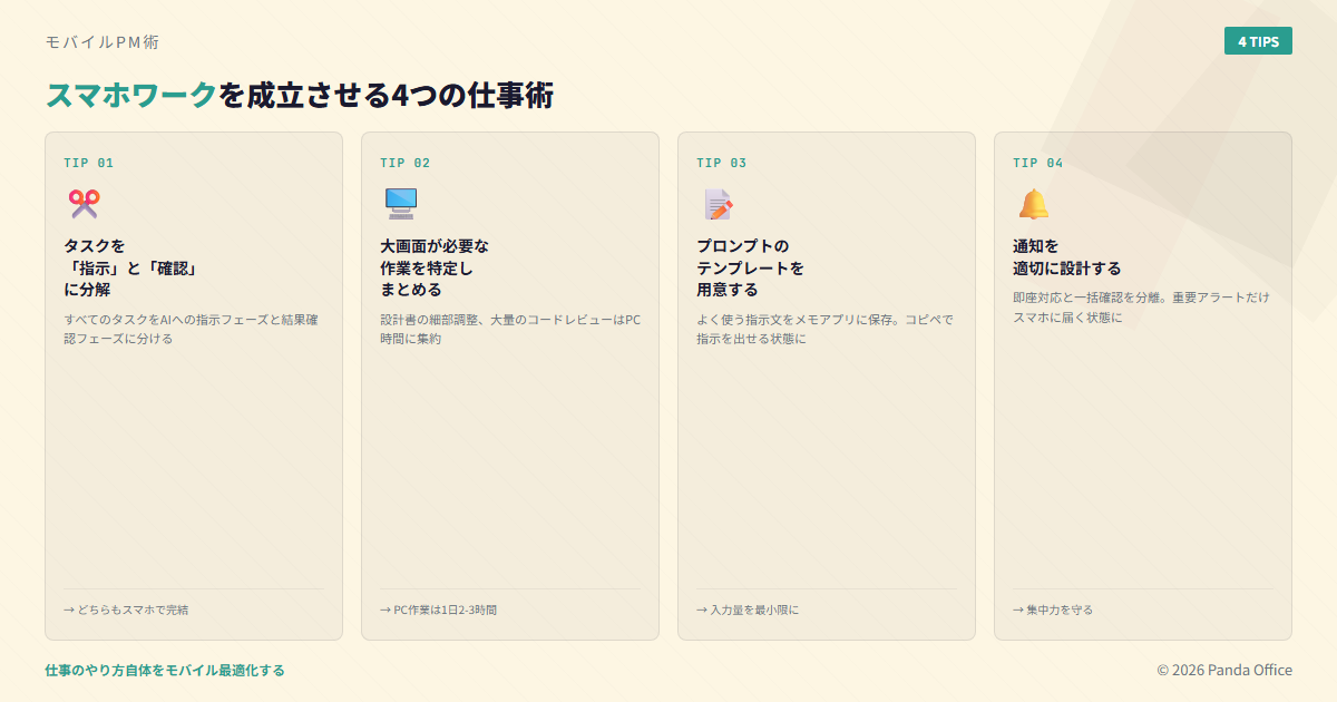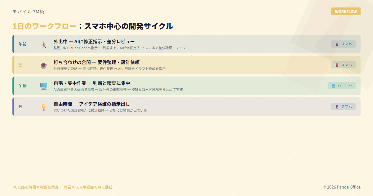 すべてのタスクを**「AIに指示を出す」フェーズと「結果を確認する」フェーズ**に分ける。どちらもスマホで完結する。この分解ができれば、ほとんどの開発業務はモバイルで回せる。
