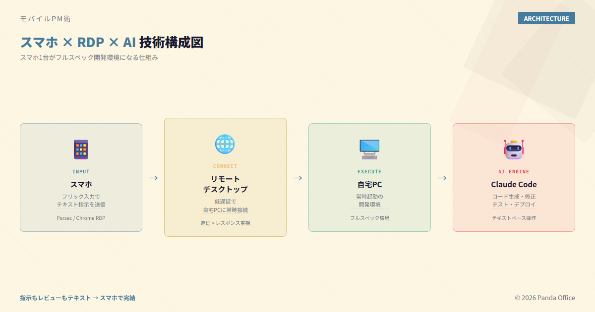 やっていることはシンプルだ。スマホからリモートデスクトップで自宅PCに接続し、AI開発ツールを操作する。それだけで、スマホがフルスペックの開発環境になる。