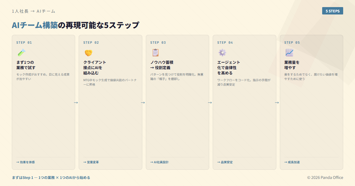 いきなりAI社員チームを組む必要はない。まずは1つの業務でAIの効果を体感する。おすすめはクライアント向けのモック作成。目に見える成果が出やすく、クライアントの反応も即座にわかる。