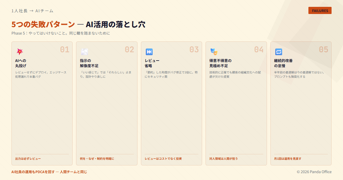 AI活用を進める中で、痛い失敗もしてきた。これからAIチームを組む方が同じ轍を踏まないよう、具体的に記録しておく。