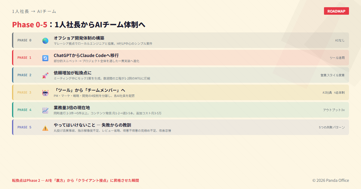 本記事では、ローカルエンジニアとの協業から、AI社員チーム体制に至るまでの全過程を、Phase 0-5のロードマップとして振り返る。