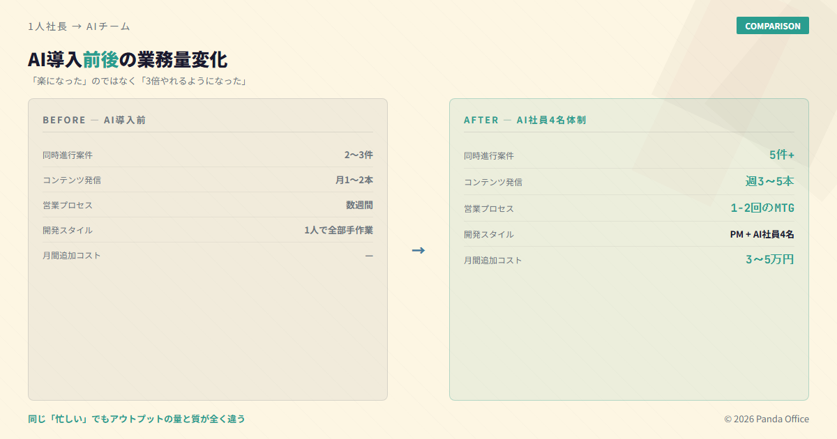 しかし、数字で見ると景色は違う。同時進行案件数は2-3件から5件以上に増え、コンテンツ発信は月1-2本から週3-5本に拡大した。月間追加コストは3-5万円。同じ「忙しい」でも、アウトプットの量と質が全く違う。