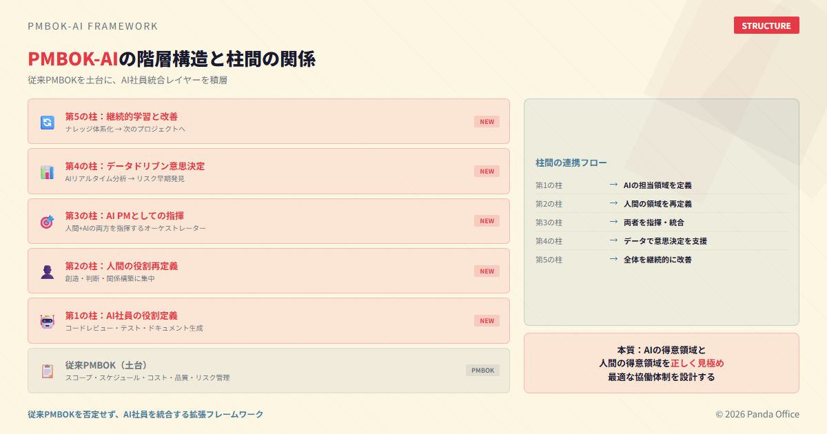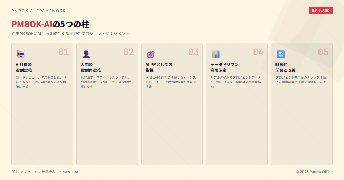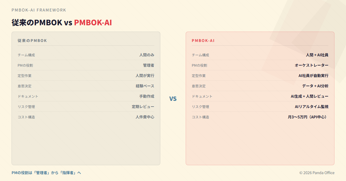 Panda Officeは、通信・建設・ITの現場で培ったPM経験をベースに、従来のPMBOK(Project Management Body of Knowledge)に**AI社員(デジタル社員)**の概念を統合したPMBOK-AIを提唱しています。