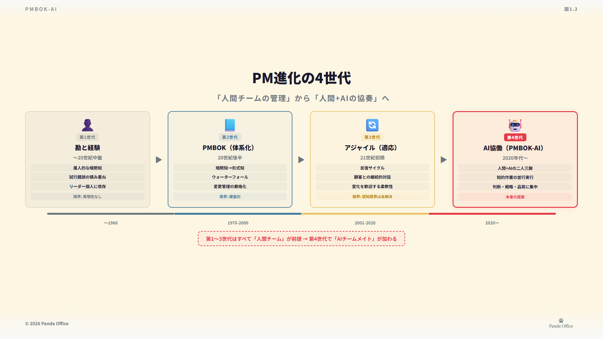 この仮説を元に、PMBOKの歴史における各フェーズは、AIとの協働という新しい視点から再定義されます。