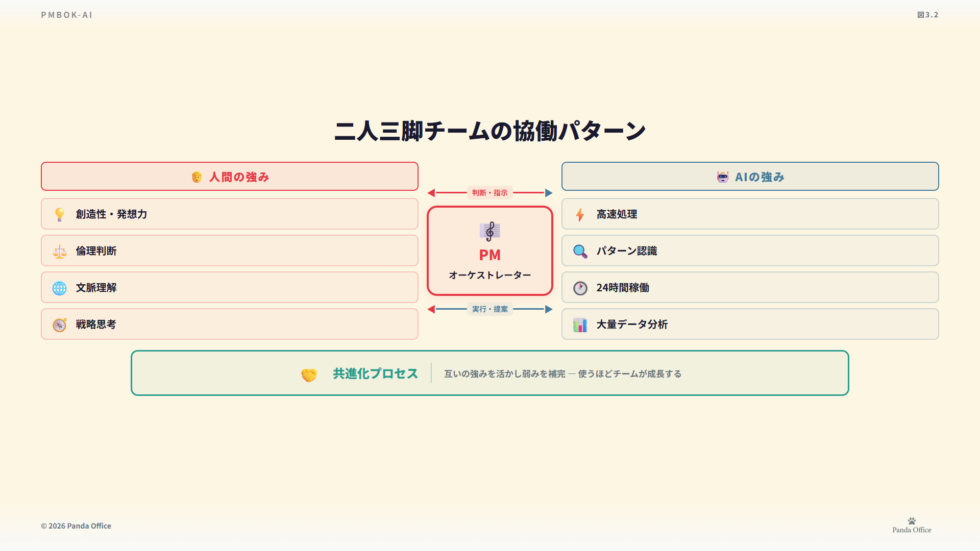 - PMBOK-AIは人間関係マネジメントを「人間とAIの協働関係マネジメント」に拡張。