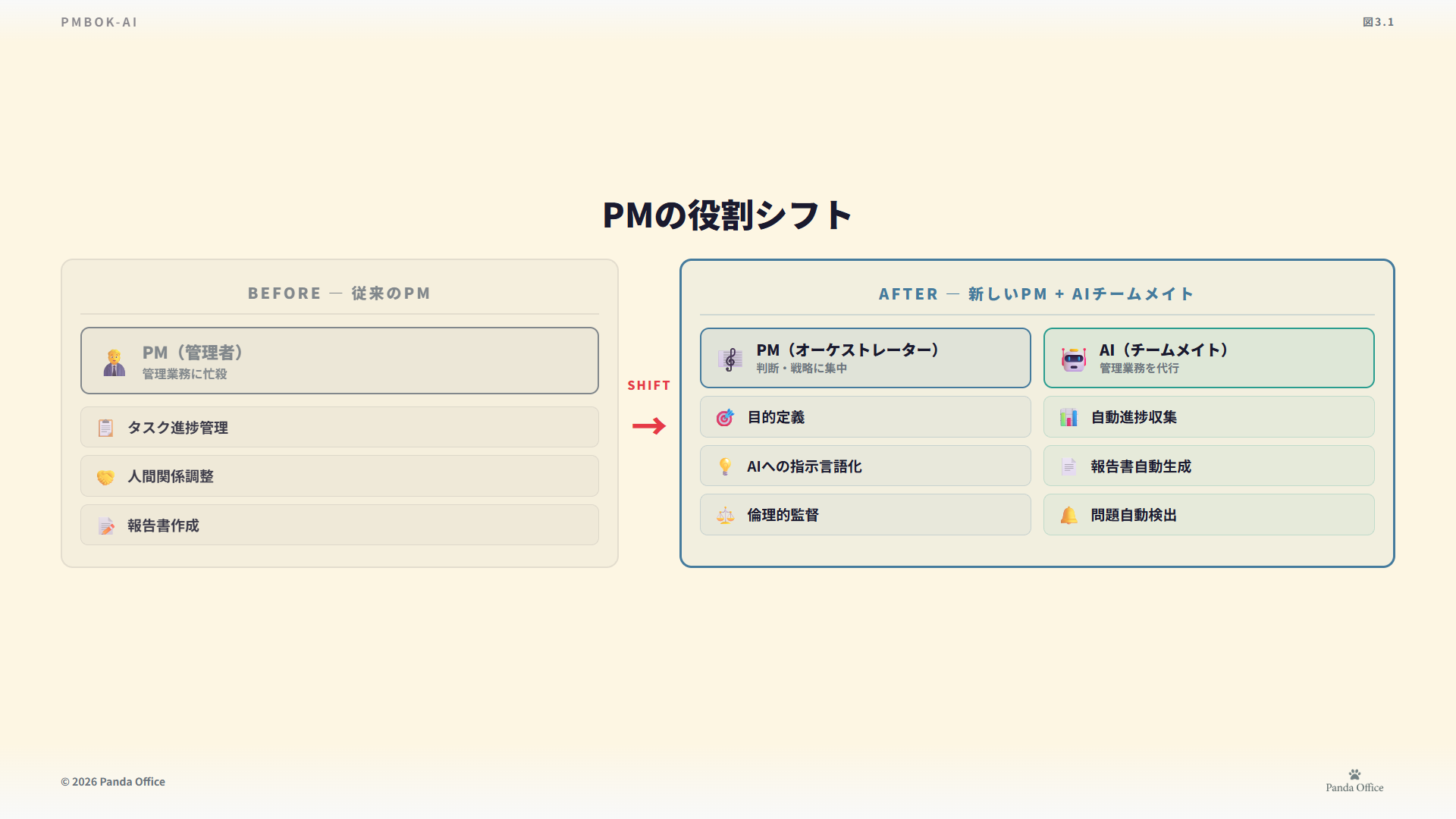 AIリーダーシップ理論が普及する未来では、PMはデータと直感、論理と倫理を融合させた、より洗練された意思決定者となります。AIがルーティンな分析や予測を担うことで、PMはより戦略的な思考、創造的な問題解決、そして人間ならではの共感に基づいたリーダーシップに集中できるようになります。PMBOK-AIは、AIが意思決定のパートナーとなる時代において、PMが自信を持ってプロジェクトをリードし、未来を創造するための新しいリーダーシップの形を提示します。AIは、PMの「意思決定の翼」となり、プロジェクトを未踏の成功へと導くでしょう。