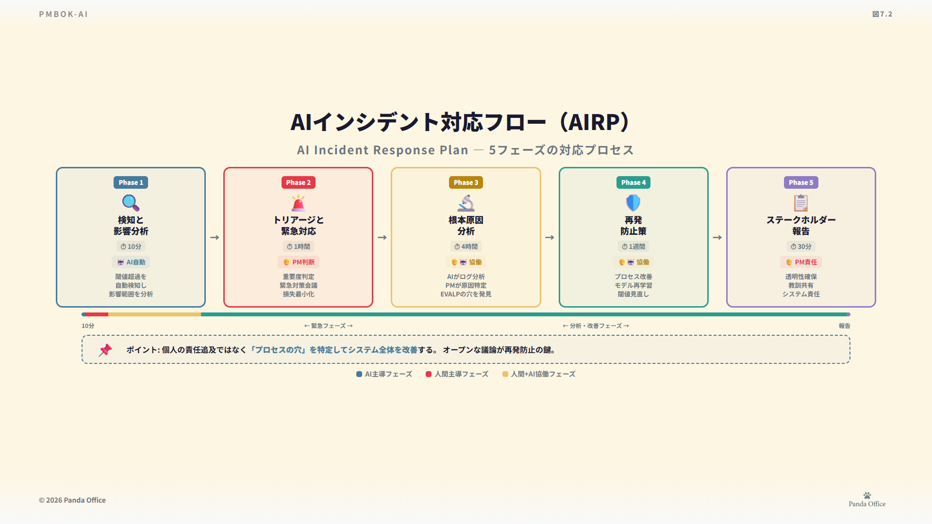 PMBOK-AIは、リスク管理と幻覚への対応をその基本理念とドメイン構成に統合します。例えば、「3. ドメイン構成」の「リスクとレジリエンス」は、AIが潜在的なリスクを予測・検知し、PMがAIと共にレジリエントなプロジェクト体制を構築することを意味します。また、「2. 基本理念」の「説明可能性(XAI Governance)」は、AIのリスク評価プロセスと根拠を追跡可能にすることで、リスク管理の透明性を高めます。PMは、AIをリスク管理の強力なパートナーとして活用し、プロジェクトの不確実性に対する耐性を飛躍的に高めます。