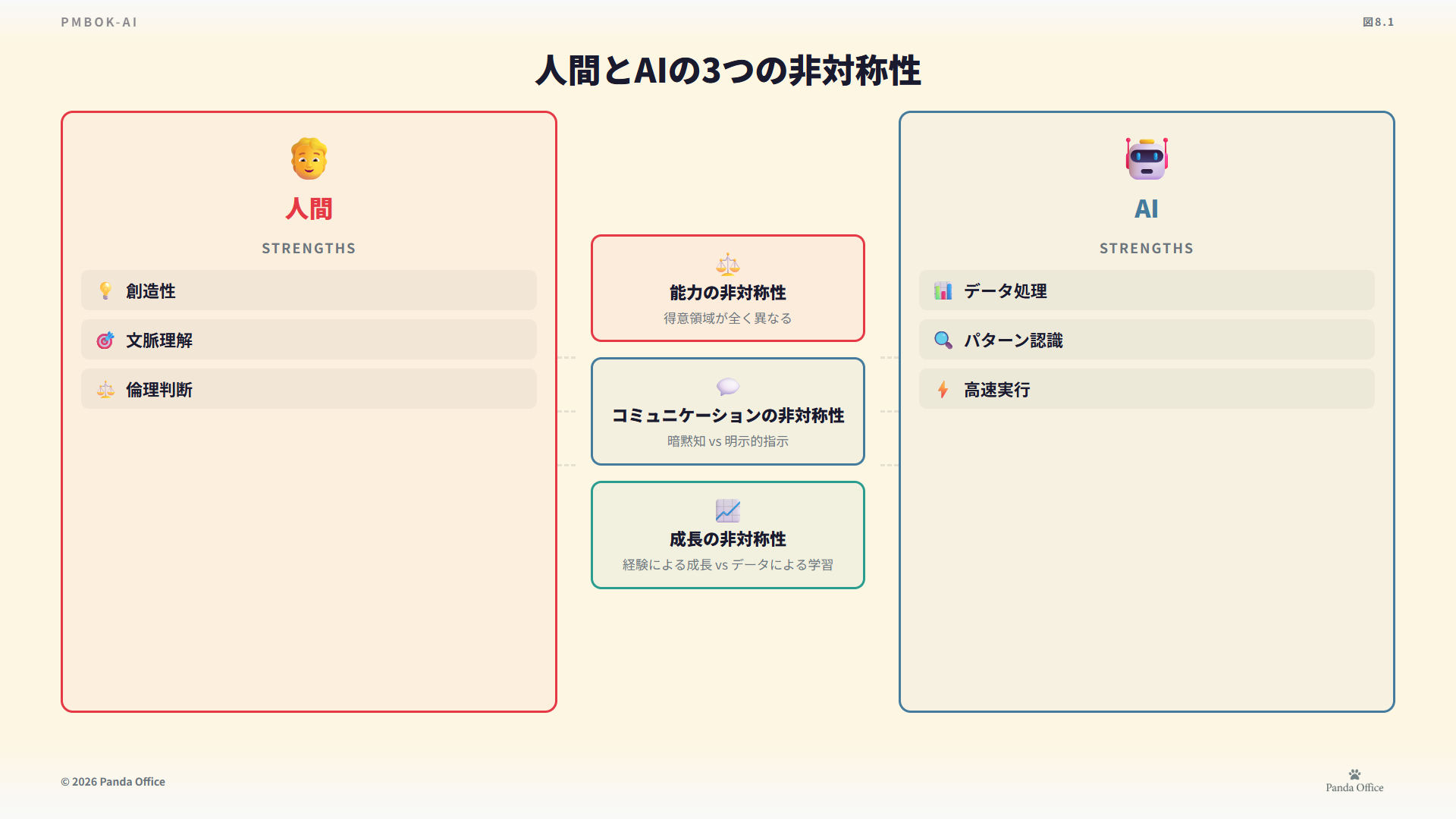 PMBOK-AIは、Human-AI Communication Labの哲学をその基本理念とドメイン構成に統合します。例えば、「3. ドメイン構成」の「ステークホルダー協働」は、AIがステークホルダーの期待値を分析し、コミュニケーションを支援することで、PMがより深い協働関係を築くことを意味します。また、「ヒューマン×エージェント・チーミング」は、人間とAIエージェントが最適な組み合わせで協働し、その間のコミュニケーションを管理することを目的とします。PMは、AIをコミュニケーションの強力なパートナーとして活用し、プロジェクト全体の調和と生産性を高めます。