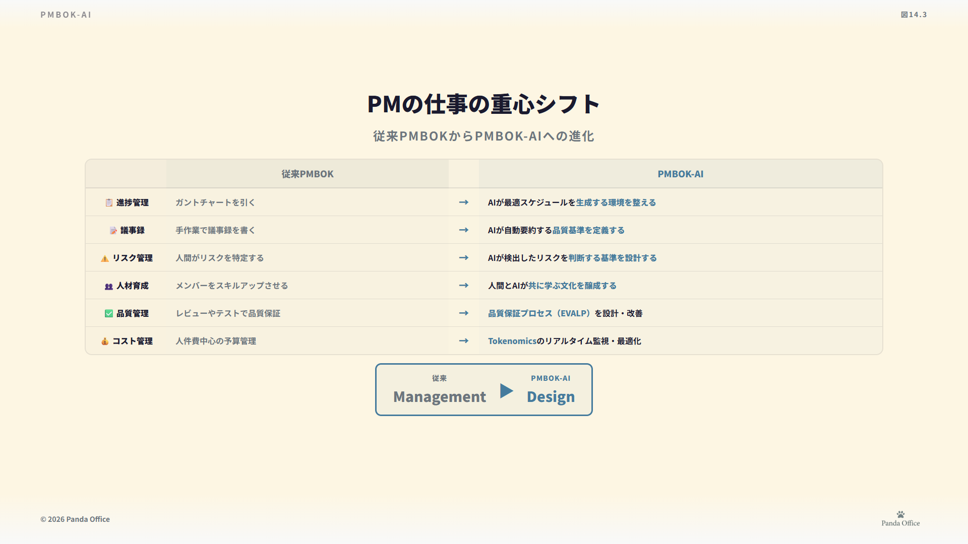 - 次世代PMBOK-AI: PMBOK-AIは、AIの自律性がさらに高まる中で、PMの役割が「AIのAIを管理する」といった、より抽象度の高いオーケストレーションへとシフトする可能性を探る。PMBOK-AI自体が、PMの学習と成長を支援するAIエージェントとなり、PMの疑問にリアルタイムで答え、最適なガイダンスを提供する。